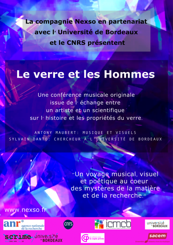 Durant l’année 2025 Nexso accueille le compositeur Antony Maubert pour une résidence de création en collaboration avec le chercheur Sylvain Danto. Durant ces temps de recherche dans les studios de Nexso il s’agira d’écrire une oeuvre hybride mêlant divulgation scientifique musique et vidéo. Une oeuvre hybride un genre nouveau, une approche moderne de la conférence scientifique ouverte à tous et rythmée par la musique ainsi que des vidéos de création. Il s’agit d’une action de médiation scientifique et ,musicale retraçant les grandes étapes de la découverte du verre, ses grandes propriétés, ses applications.